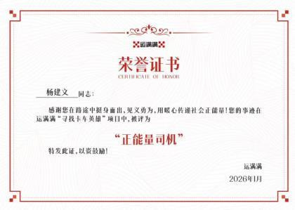 1月19日,运满满正式授予杨建文“卡车英雄·正能量司机”称号,致敬其以干线侠义,锻造公路脊梁。