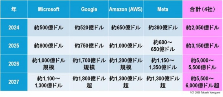 2025年至2027年间,天下主要超大边界数据中心运营商接头大边界投资东谈主工智能基础法度,其中好意思国前四大超大边界数据中心运营商的老本投资边界尤为重大。