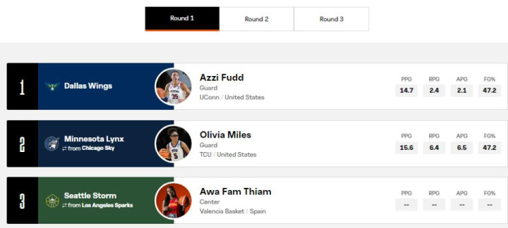 榜眼是明尼苏达山猫选中TCU控卫奥利维娅-迈尔斯,开云西雅图风暴用探花签选中西班牙中锋阿瓦-法姆。