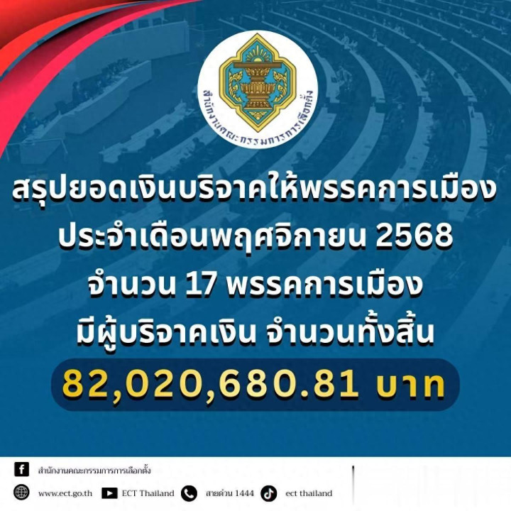 泰国头条新闻社讯 1月21日,泰国选举委员会(EC)公布数据显示,2025年11月共有17个政党在相关统计期内获得捐款,总额涉及82笔,向政党捐款金额在5000泰铢及以上的捐款人共计222人,捐款总额为82020680.81泰铢。其中自豪泰党获捐金额最高,达5800万泰铢;民主党获捐610万泰铢;新泰前进党获捐540万泰铢;而为泰党仅获捐1万泰铢。