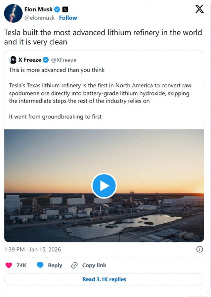 埃隆·马斯克对该项目寄予厚望,他在不同场合分别强调,该基地是目前全美“最先进”且“规模最大”的锂精炼厂。从2023年破土动工到2026年正式投产,特斯拉再次通过高效的执行力,将原本漫长的化工建设周期大幅压缩。