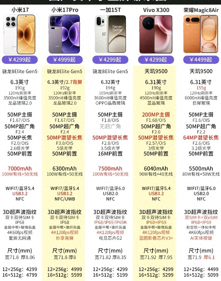 当先来看解决器设立。小米17和小米17 Pro均搭载了高通骁龙8 Elite Gen5出动平台,这是一颗领受最新制程工艺的旗舰芯片,在CPU和GPU性能上皆有大幅擢升。一加15T相同选拔了骁龙8 Elite Gen5解决器,保证了顶级的运算能力和图形解决速率。而vivo X300和荣耀Magic8 Air则领受了联发科天玑9500芯片,这颗芯片在能效比和多核性能上清晰出色,相同属于旗舰级别。五款手机皆配备了3D超声波指纹识别本事,解锁速率和安全性皆达到了很高水准。
