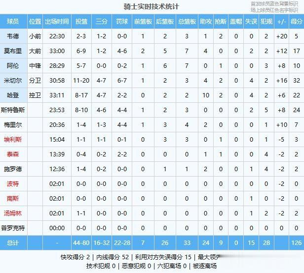 米切尔32分3板4助2断、斯特鲁斯24分3板、哈登22分2板10助2断、莫布里17分7板4助、阿伦10分7板、梅里尔7分4板2助、韦德5分3板1助2断、埃利斯3分3板