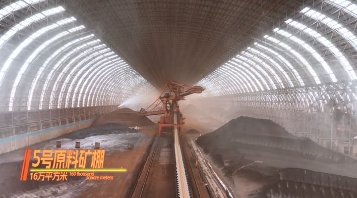 16万平方米的棚仓,长度达855米,约等于22.4个标准足球场,堆放的铁矿粉等钢铁原料数量巨大。这些原料在运输过程中易产生粉尘,特别是斗轮机启动后,它会像水车一样不断将铁矿粉等原料运输到皮带上,供下一个环节使用。在这过程中,挖掘机、铲车、渣土车等工程车辆不时会协同作业,产生更多的粉尘源,导致粉尘浓度升高。